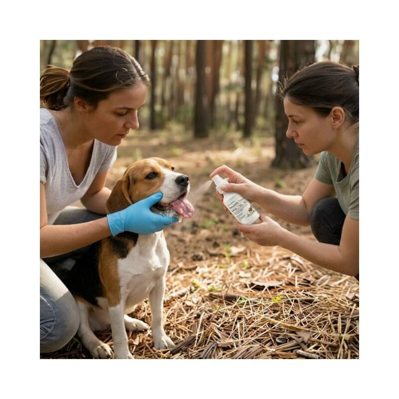 PRESENTACIÓN: Envase de 100 ml fácil de manejar y aplicar, que permite pulverizar de forma uniforme sobre las zonas afectadas. Su tamaño compacto cabe en el bolso de paseo, la mochila o el botiquín del perro, siendo ideal para tenerlo siempre a mano tanto en casa como durante excursiones o viajes