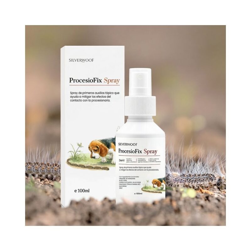 PROCESIOFIX Spray ayuda a inactivar toxinas, calma la irritación y contribuye a retirar los pelos urticantes tras el contacto con la oruga procesionaria.